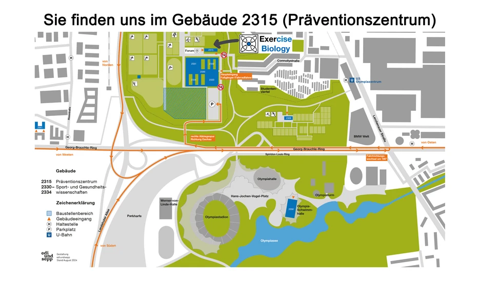 The TUM Campus in the Olympic Park is in the north of Munich (Milbertshofen). Our labs and offices are in the Prevention Center in the Connollystraße 32 (Building 2315). Please use the parking places at the south of the main building. See overview.