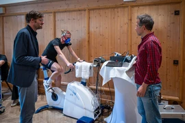 The topic was brought to life by Katie Rainsberger, Research Associate and PhD student at the Associate Professorship of Exercise, Nutrition, and Health. During the event, she got on an exercise bike and pedaled for about 20 minutes at a power output of 180 to 200 watts. Meanwhile, Prof. Köhler explained to Willi Weitzel what happens in the body and how energy is measured.