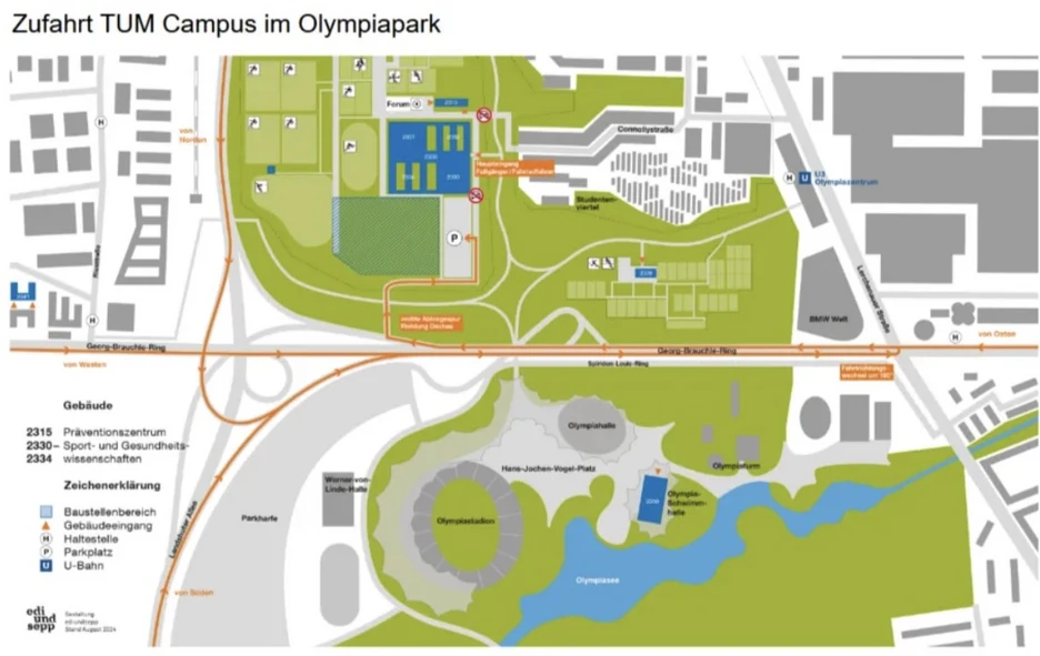 Coming from the west on the A8: Drive to the end of the highway, then take Verdistr., Menzinger Str., Wintrichring onto Georg-Brauchle-Ring, staying in the right lane to make a 180° turn (U-turn). Take the right lane , the B304 lane towards Dachau, but don't miss the right turn lane to the TUM Campus in the Olympic Park (see map)