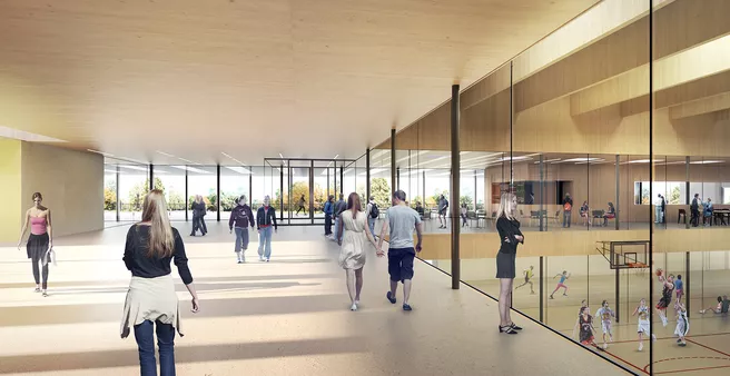 Auf dem einstigen Olympiagelände entsteht in den kommenden vier Jahren ein Gebäudekomplex mit sechs Innenhöfen. Die Bauten werden vornehmlich aus Holz und Glas errichtet. "Ich freue mich, dass wir diesen Baukörper realisieren können, der sich ruhig in das Ensemble des Olympiaparks einfügt und gleichzeitig die fortschrittliche Holzbauweise umsetzt", sagt Anja Hagemoser vom Staatlichen Bauamt München 2. Tatsächlich greift der Entwurf des Bregenzer Architekturbüros Dietrich Untertrifaller die Idee einer "Olympischen Landschaft" bewusst wieder auf. "Das neue Sportcenter im Olympiapark wird ein in seiner Dimension rekordverdächtiger Holzbau", erläutert Helmut Dietrich, der Geschäftsführende Gesellschafter des Architekturbüros - "und zwar mit allen Qualitäten wie Leichtigkeit, Nachhaltigkeit und Energieeffizienz. Bauweise und Architektur sind eine logische Antwort auf die sportliche Aufgabenstellung und den besonderen Ort im denkmalgeschützten Park."