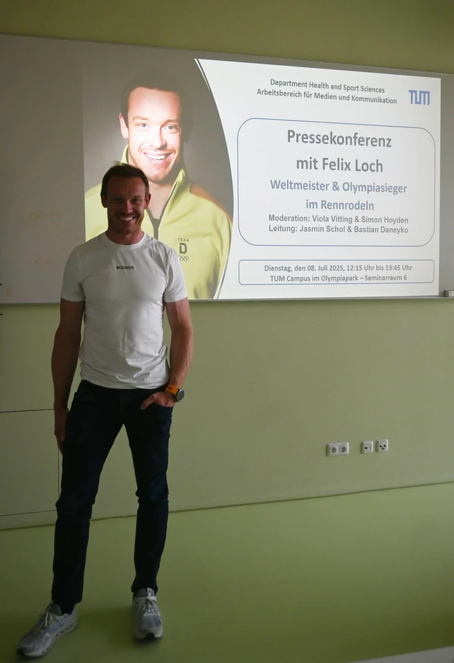 Felix Loch ist als mehrfacher Weltmeister und Olympiasieger im Rennrodeln einer der erfolgreichsten deutschen Wintersportler überhaupt. Neben seiner herausragenden sportlichen Karriere zeichnen ihn auch eine große Bodenständigkeit und sein gesellschaftliches Engagement aus. Am vergangenen Dienstag, den 08. Juli 2025 war er auf Einladung der beiden wissenschaftlichen Mitarbeitenden Jasmin Schol und Bastian Daneyko zum wiederholten Mal zu Gast am Arbeitsbereich für Medien und Kommunikation.