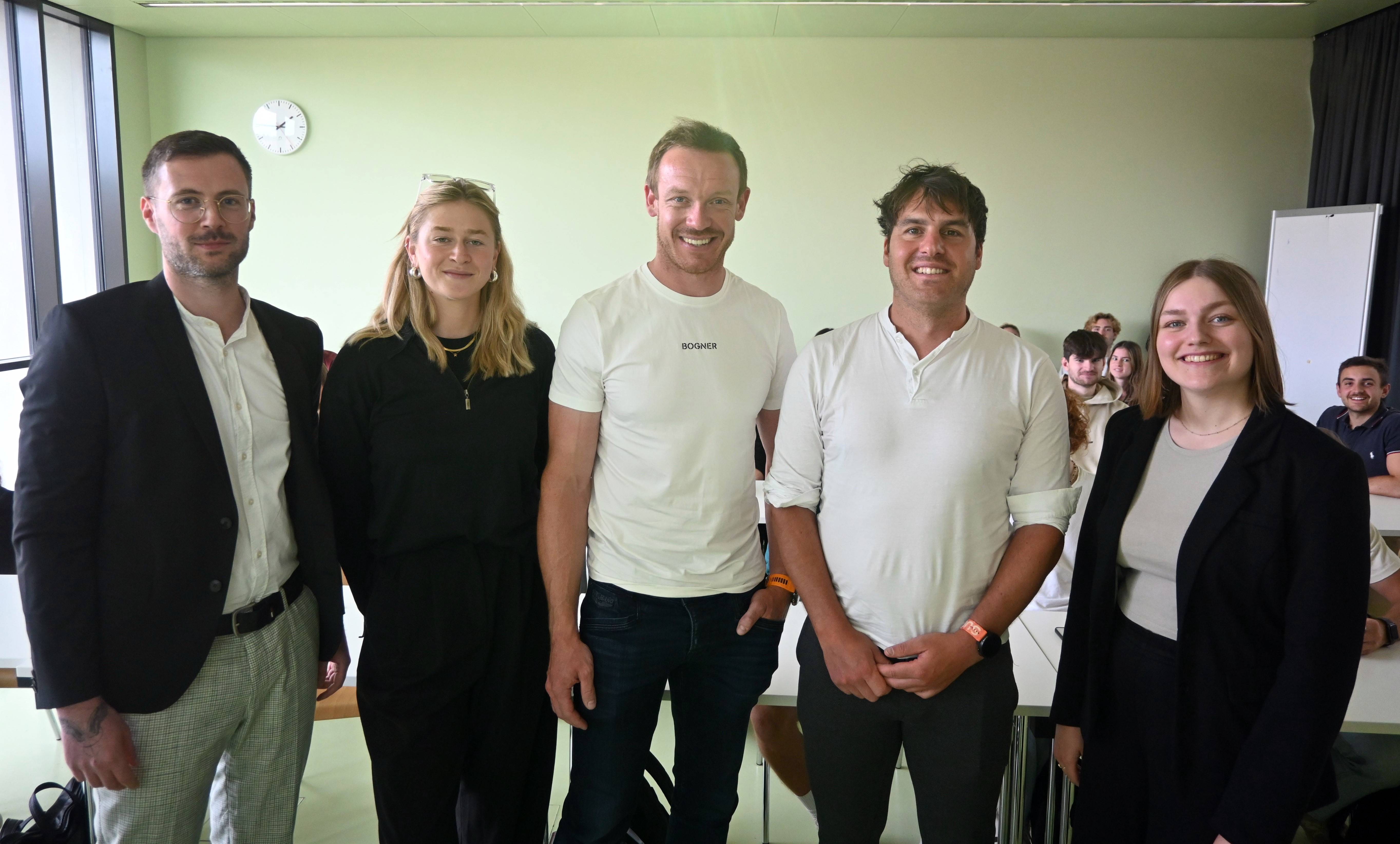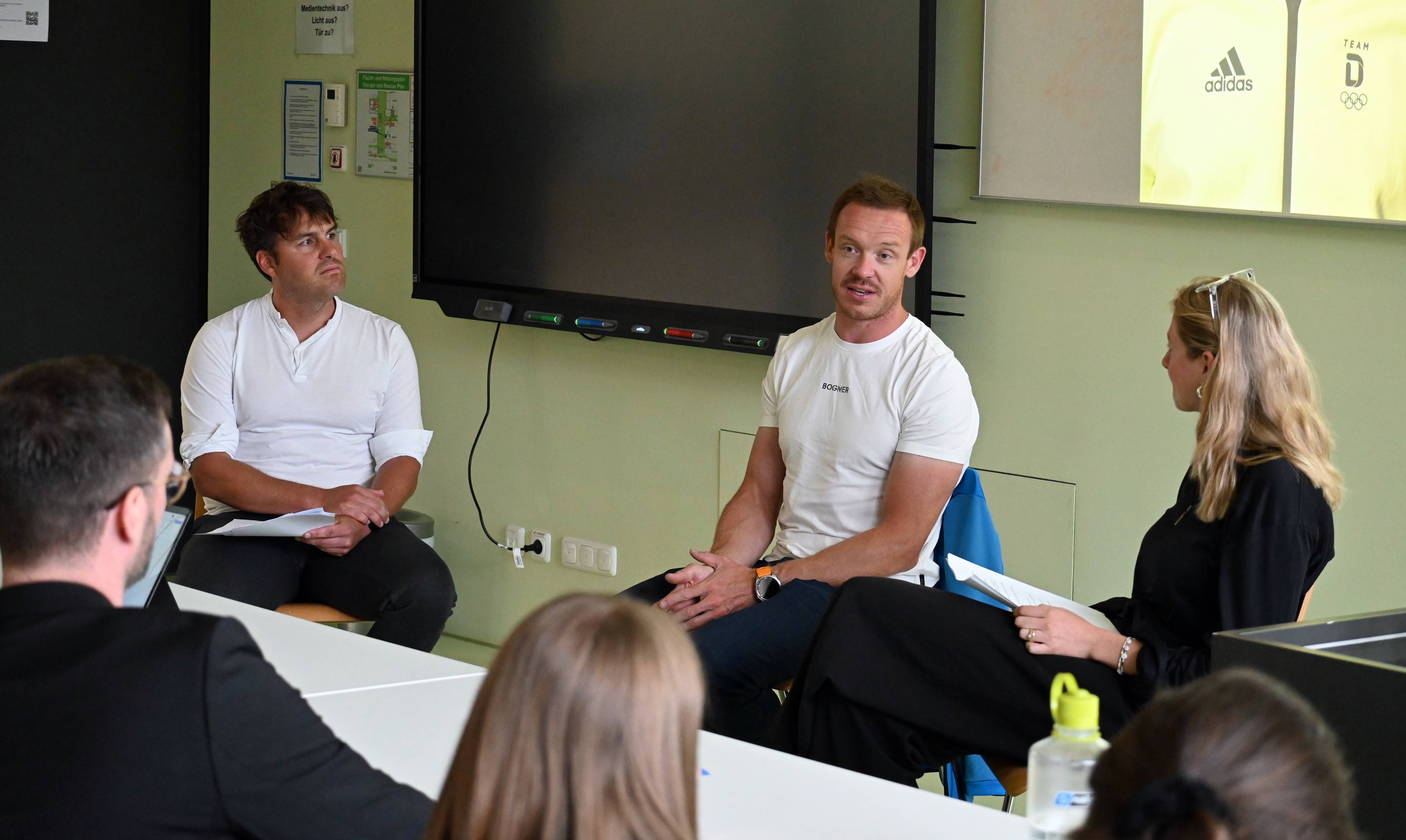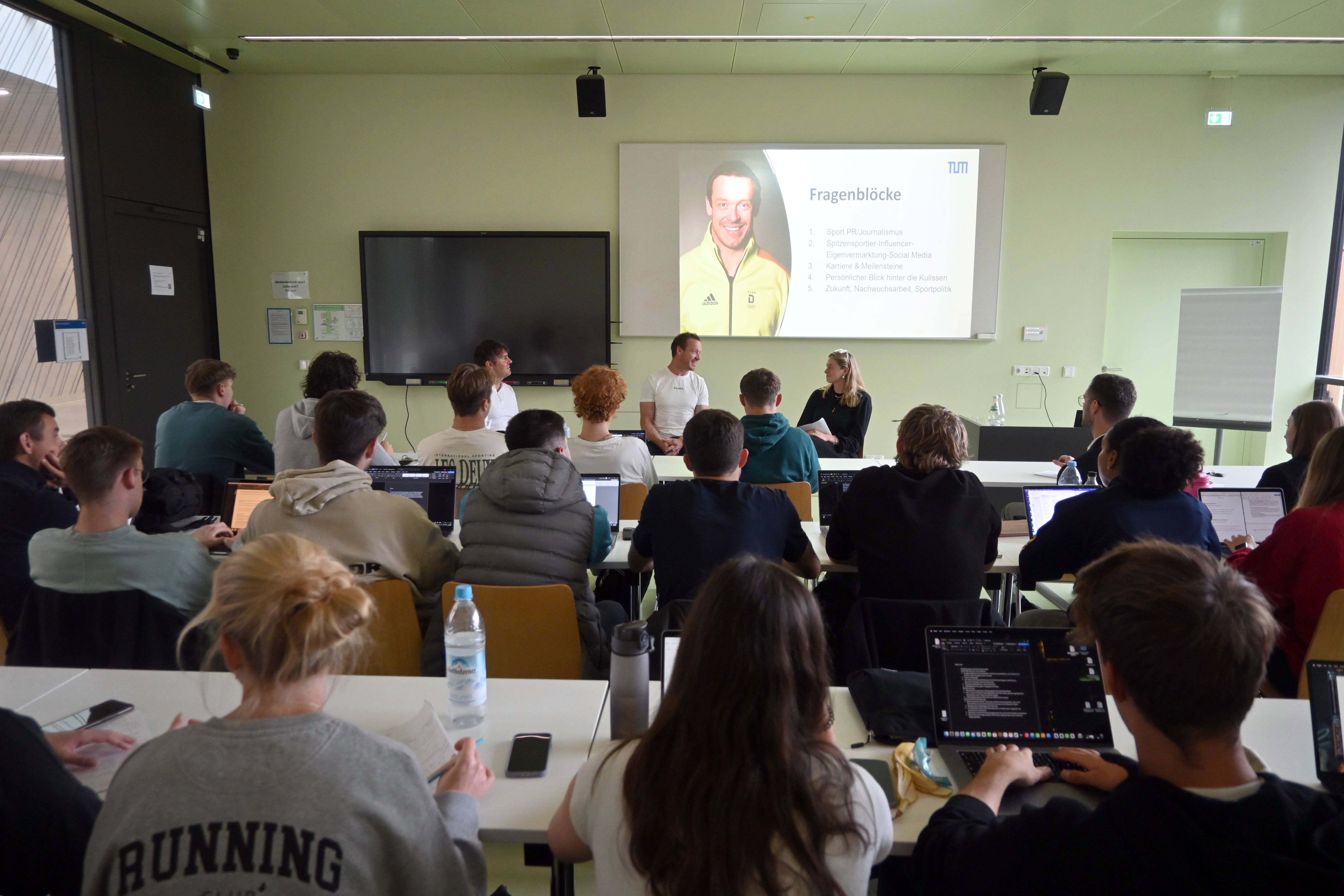 Im Rahmen des Seminars „Sport-PR-Instrumente“ beantwortete Loch vor rund 40 Studierenden Fragen zur Rolle von Social-Media im Sport, zu seinem Umgang mit der Presse und gab Einblicke in seinen Trainingsalltag. Moderiert wurde die Praxis-Übung von den Studierenden Viola Vitting und Simon Hoyden.
